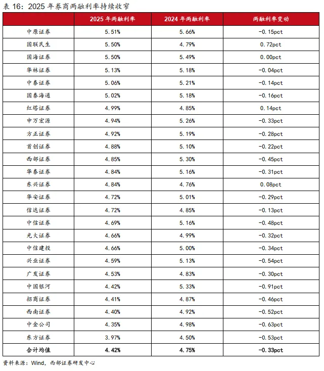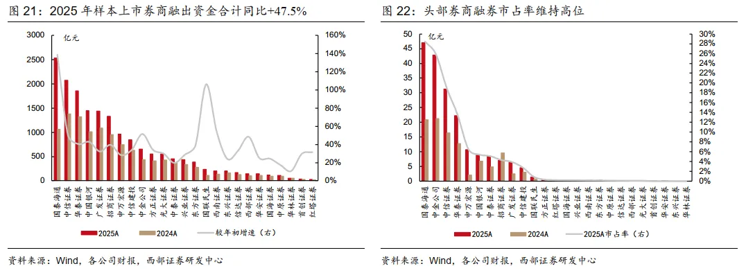 权益市场风险偏好改善下样本上市券商融资、融券规模提升,两融利差持续收窄。得益于924以来市场交投活跃及投资者风险偏好改善,2025年25家样本券商融出资金均实现同比增长,合计较2024年末+47.5%,同时市场交易带动25家券商融出证券大多实现正增,头部券商如国泰海通、中金公司融券市占率维持高位在28.5%、25.9%,集中度较高。以2025年两融利息收入除以期初期末两融规模均值测算两融利率水平,截至2025年末,25家样本券商两融利率均值为4.42%,较2024年末-0.33pct,其中中国银河、中金公司两融利率下滑幅度更大。