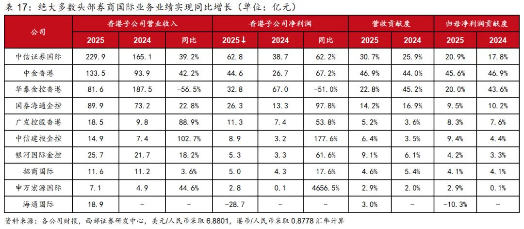收费类业务全面改善,用资业务表现突出,国际业务快速发展。1)收费类:25年日均股基成交额同比+70%,券商代买代销净收入高增,行业佣金费率于下半年明显下降;A/H股权融资明显修复,尤其是港股IPO表现突出,头部券商投行净收入25Q4环比高增;上市券商资管净收入和规模基本稳定,旗下参控股公募子公司业绩有所分化。2)资金类:上市券商自营投资收益同比增长,25家上市券商年化投资收益率中枢达到4.3%,合计金融资产投资规模较年初+18%, TPL、OCI股票仍为上市券商用资的主要方向,头部券商另类+直投子公司业绩大幅改善,利润贡献提升;市场稳定向好下两融规模快速提升、融资收益率明显下降至4.42%,两融利息收入增加和负债成本下降下行业利息净收入有所回暖。3)国际业务:2025年头部券商国际子公司表现亮眼,贡献占比继续提升,中信国际、中金香港、华泰国际占集团净利润比重均超过20%,国际业务将成为券商竞争的重要角逐地,许多头部券商近年来向国际子增资,此外也有中小券商申请设立香港子公司。