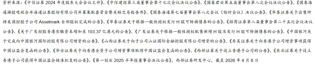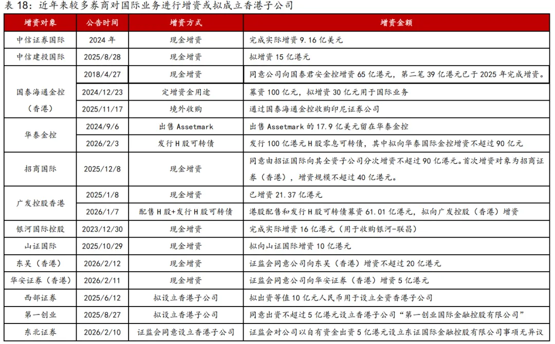 券商持续向香港子补充资本,支撑境外业务扩表与杠杆提升。从业务布局来看,中资券商大多以中国香港为出发点,持续加速在新加坡、中东等市场的布局,此外,多家头部券商通过增资、担保与并购等方式进一步加强对国际业务的支持,如广发证券2025年向广发控股香港增资21.37亿港元,2026年1月港股新募资资金61亿港元也将用于增资国际子公司;华泰证券2026年发布公告计划拟增资90亿港元支持境外业务发展。2025-2026年部分中小券商如西部证券、第一创业、东北证券等也发布成立香港子公司公告。随着中资券商国际业务布局的不断拓展及资本实力的不断充实,国际业务有望成为未来券商发展的另一重要引擎。