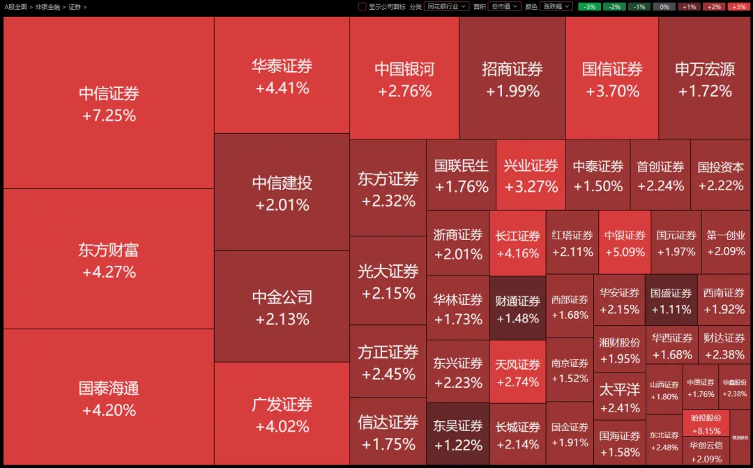 然后今天你们也看到了,券商板块,尤其是那几个大家伙,直接高开,然后……没低走。没低走,这挺关键的。华泰、广发,涨了四个多点。中信更猛,最高冲到快九个点,差一口气就摸板了。