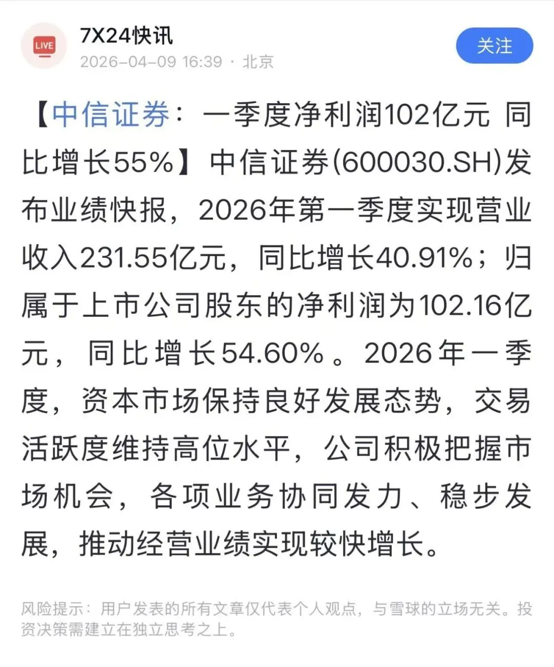 今年中信证券一季报预告,净利润102亿,同比增长55%。
