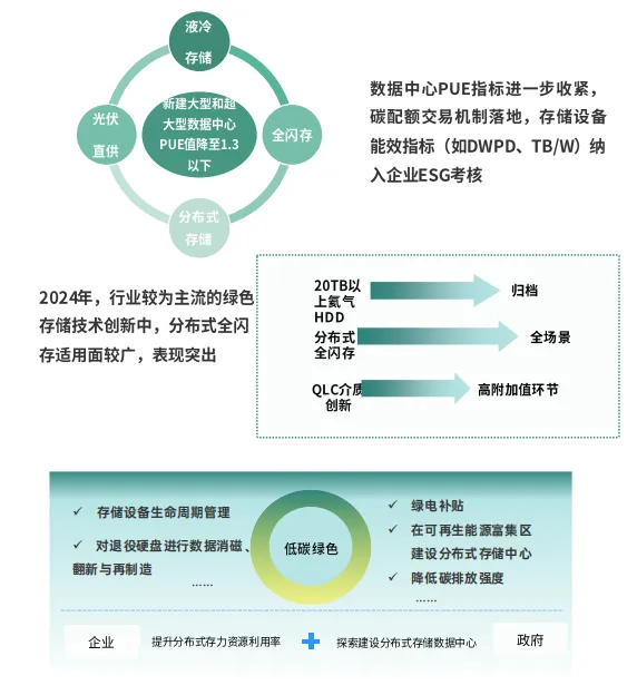 "双碳" 目标, 特别是2030年 "碳达峰" 目标迫近, 分布式存储凭借自身低能耗、高能效优势, 将迎来增长高峰。一方面, 能耗管控政策加码, 碳配额交易机制落地,另一方面, 技术创新驱动能效提升, 超大容量存储介质和液冷等新兴技术落地, 促进了分布式存储加快普及、协同发挥低碳绿色作用。除此之外, 政府和企业探索循环经济新模式, 为分布式存储替换传统集中式存储提供了机会, 一定程度上也促进了分布式存储的普及。