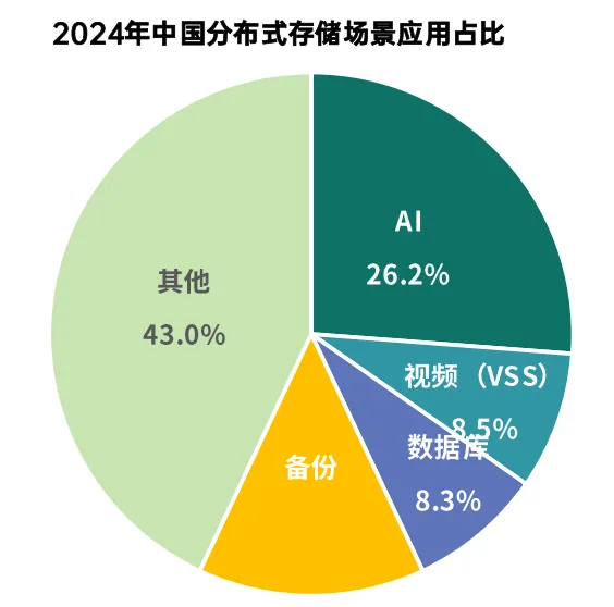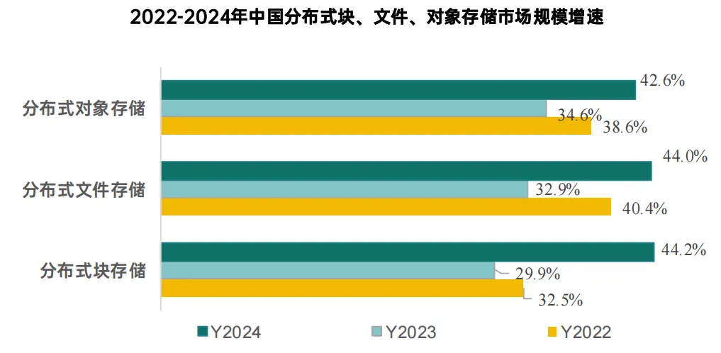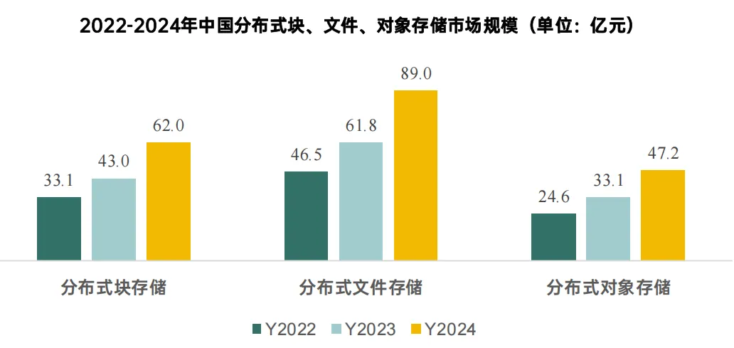 2024年 ,分布式文件存储除了广泛应用在备份、数据库等传统场景 ,在AI等新兴场景也加快应用 ,规模上与块和对象存储的差距进一步拉大 ,在整个市场中占比最高, 2024年市场规模为89.0亿元 。受整体市场向好影响 ,分布式文件存储的增幅相比 2023年提升了11.1个百分点 ,为44.0%。分布式块存储主要应用在云 、备份等场景, 2024年市场规模为62.0亿元 ,增速为42.6%。分布式对象存储主要应用在音频 、视频等非结构化数据上, 随着非结构化数据占比不断提升 ,其规模也快速增长 ,但与较为成熟的块 、文件存储仍有一定差距。 2024年市场规模为47.2亿元 ,增速为 44.2%。