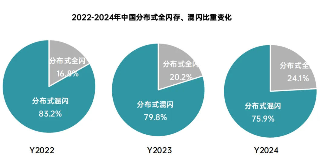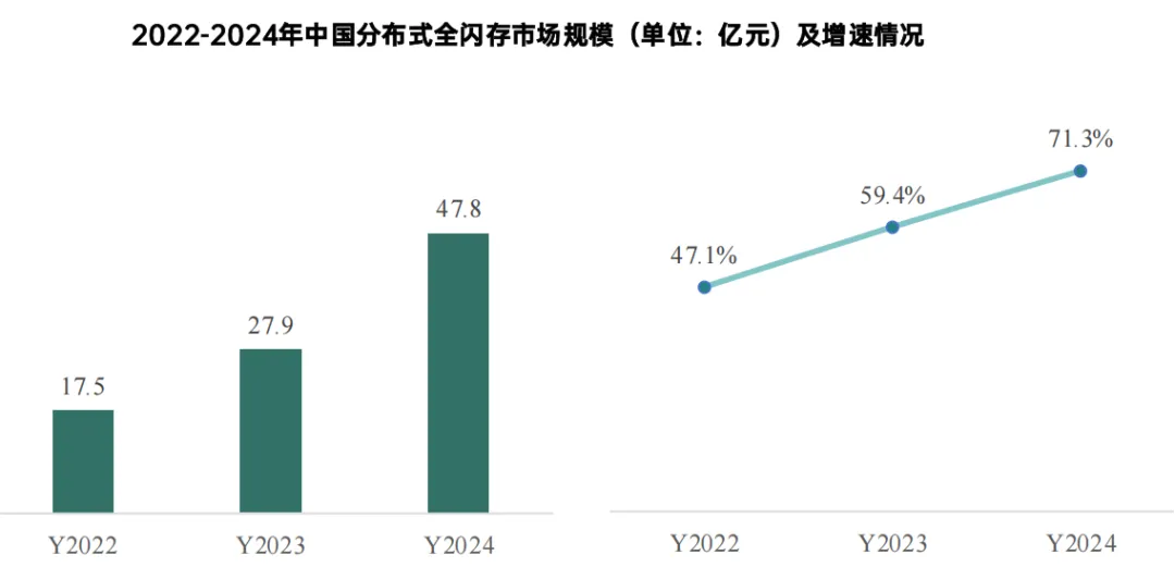 2024年 ,分布式全闪存成本进一步下降 ,相比上一年平均价格下降近10个百分点,同时亚毫秒级延迟 、百PB级空间 、百万级IOPS等优势进一步显著, 普及速度加快。 2024年, 中国分布式全闪存占比为24.1% ,主要应用在I/O要求较高的场景和行业,如AI 、科教行业等 ,在自动驾驶 、具身智能等行业也有突出表现 ,市场规模快速增长 ,达到47.8亿元 ,相比2023年增长了71.3% ,高于整体市场近30个百分点。尽管分布式全闪存的市场规模较小 ,但随着闪存价格持续下降, 以及用户对分布式存储性能要求不断提升 ,新场景、新行业将快速拓展 ,未来普及速度有望进一步提升。