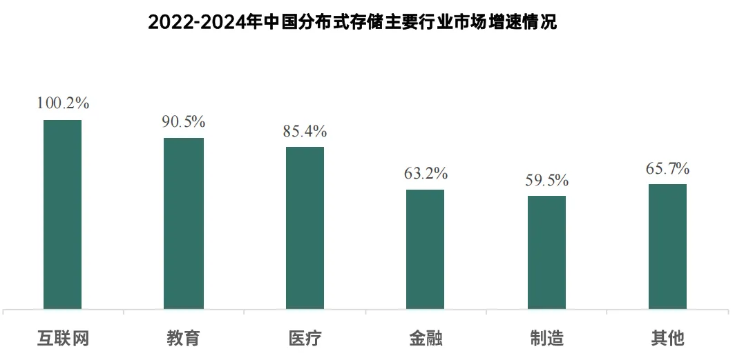 从场景看, 2024年 , 中国分布式存储场景市场集中度显著提升, AI、视频(VSS) 、数据库、备份等场景的占比之和超过半数。其中受益于新建智算中心广泛应用分布式存储 ,AI场景占比达26.2%。从行业来看 ,互联网、教育 、医疗占比之和为69.6% ,且均处于高速增长阶段 ,上述行业市场增速均翻了一番 ,助力敏态业务数字化转型的作用显著。教育行业市场上 ,分布式存储在推动材料 、物理 、化学 、生信等学科与计算机科学深度融合 、催生新兴学科建设 、现代科学技术在高校的普及, 以及在稳定可靠的集中式存储的替换迁移发挥着重要作用 。在医疗行业市场上, PACS 、医疗影像等需求逐年走高, 带动分布式存储在医疗行业的规模也持续快速增长。