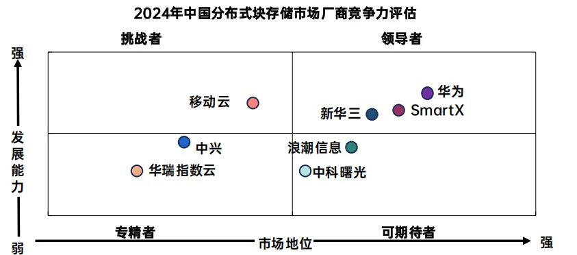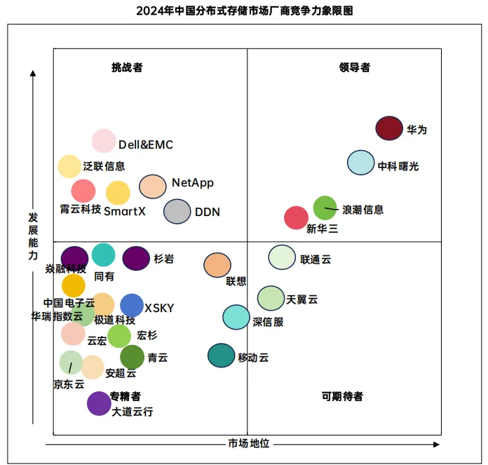 2024年, 中国分布式存储市场上的主要厂商深耕专精市场 ,紧抓“东数西算”2.0、全闪存普及等机遇, 实现快速发展。按销售额等市场地位指标, 以及产品创新能力 、用户反馈等发展能力指标 ,赛迪顾问将厂商分为领导者、挑战者、专精者和可期待者四 类 。 其中 华为 、 中科曙光等中国厂商占据市场领导者位置 , 挑战 者则多 为 Dell&EMC 、NetApp等国外厂商, 以及泛联信息 、霄云科技 、SmartX等厂商。专精者指在某一细分行业或场景市场表现较好的厂商 ,尽管市场份额和技术能力上与综合类厂商有一定差距 ,但仍具有较强竞争力 ,如杉岩、中国电子云 、极道科技、华瑞指数云等 ,可期待者指销售额领先 ,但产品有待加快创新的厂商, 比较典型的有联通云、天翼云等。