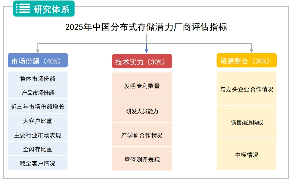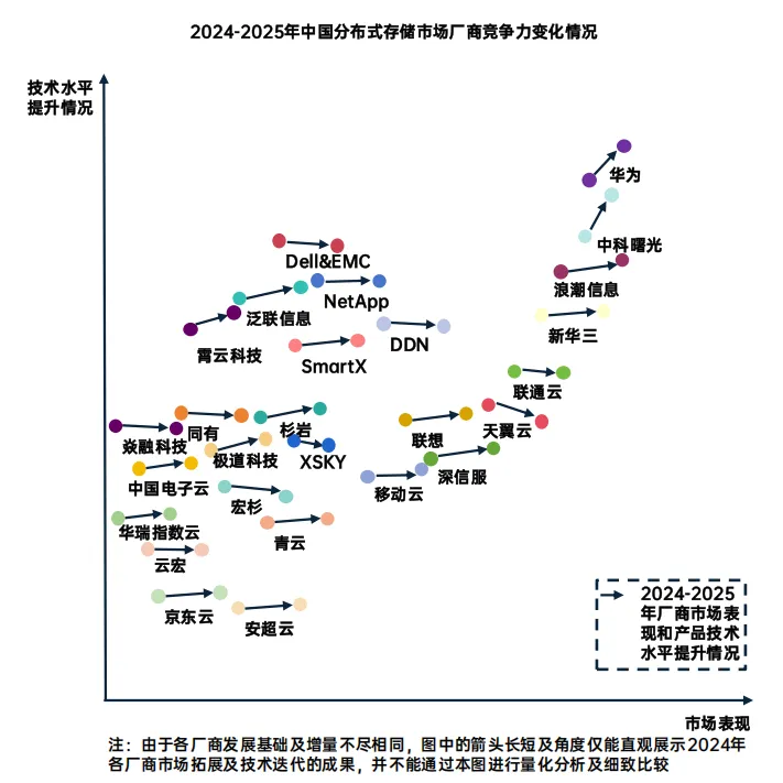 2024年, 标准生态完善、分布式全闪存加速普及和 "东数西算" 工程升级为分布式存储市场发展提供良好机遇,中国分布式存储厂商竞争力持续提升, 其中华为、中科曙光等中国厂商占据市场领导者位置,挑战者则多为Dell&EMC、NetAPP等国外厂商, 以及泛联信息、霄云科技、smartx等厂商。通过评估厂商市场份额、 技术实力和资源整合能力, 本报告评选出2025年中国分布式存储潜力厂商TOP4。