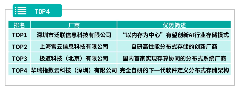 在2024年中国分布式存储市场中 ,部分新兴厂商表现出强劲的竞争力 ,个别厂商在一些细分领域的表现与龙头厂商相当 ,未来发展潜力巨大 。为客观全面考察上述企业 ,本报告通过调研20余家分布式存储厂商 ,通过评估其市场份额、技术实力和资源整合能力 ,加权后得到2025年中国分布式存储潜力厂商TOP4。