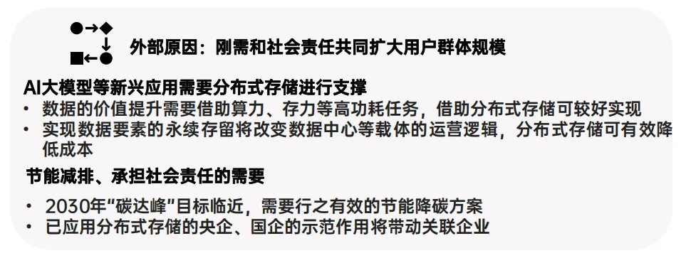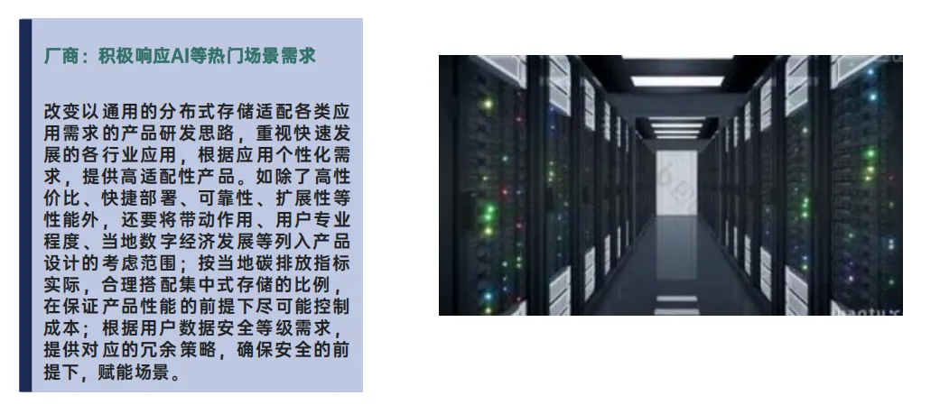 以DeepSeek为代表的国产AI大模型的技术突破与商业化落地 ,重塑了分布式存储市场的需求逻辑。一方面 ,算力需求指数级增长 ,技术适配挑战加剧 ,对存储底座性能要求不断提升;另一方面 ,算力生态厂商加快算力应用层次和商业模式创新,从而带动存储快速迭代支撑能力。分布式存储在这一过程中显露出优异性能、安全可靠 强拓展性 因此发展速度较快 。