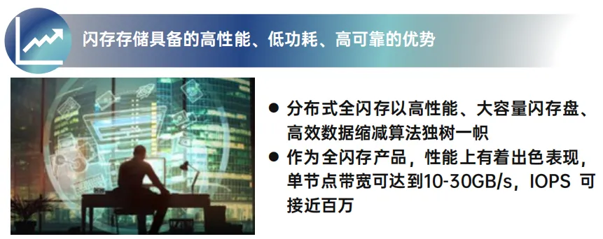 分布式全闪存以数据的长期 、可靠 、绿色低碳 、高性能存取为目标 ,支持超大规模数据的弹性存储。具备全闪架构超高性能 、线性扩展 、绿色低碳 、长期可靠等特性。产品可为虚拟化/云资源池、数据库 、高性能计算、AI应用 、大数据分析等场景提供高效的数据存取服务。