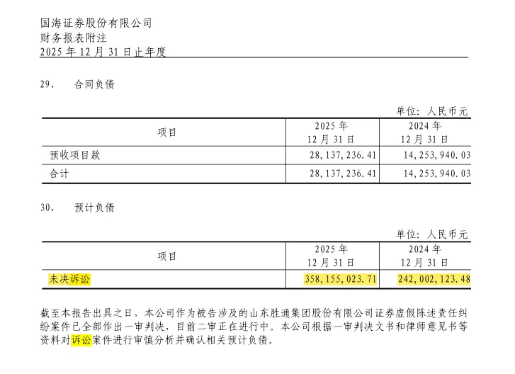 国海证券已在2025年度为此计提预计负债11,615.29万元,对应减少净利润8,711.47万元,也就是说公司已经把这笔赔偿"预先算进亏损"了。同时,国海证券已就相关一审判决提起上诉,最终赔偿金额以二审结果为准。