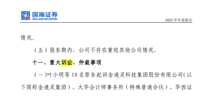 21.创金合信基金管理有限公司(专项管理人,受托金睿22号、金睿23号双资产管理计划)起诉国海证券、中天运会计师事务所、大公国际证券虚假陈述责任纠纷一案(案号:〔2023〕鲁02民初207号,该诉讼足额纳入2023年年度报告披露范围),裁判及上诉节点:2025年12月18日,青岛中院出具标准《民事判决书》,核定中天运会计师事务所、国海证券、大公国际依次按比例对5,261.69万元赔偿金额承担连带清偿责任,驳回原告其他全部诉求。2026年1月6日,公司合规办结流程,向山东高院提起二审上诉。
