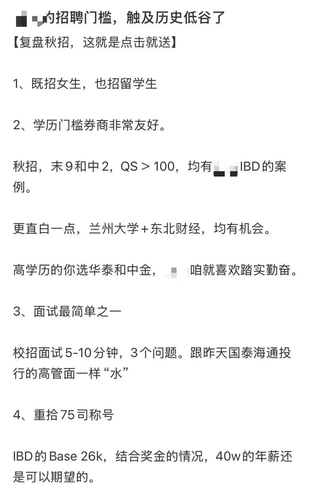 在小红书看到“Pony侃侃求职”的帖子,说到某头部券商的招聘门槛,触及历史低谷了。