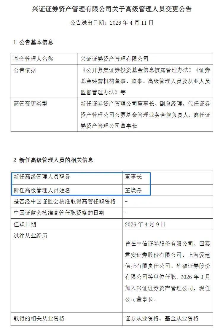 2026年4月11日,兴业证券资产管理有限公司发布公告显示,正式任命王焕舟为公司董事长。原董事长刘宇因工作调动原因,不再担任该职务。此次人事调整是2026年以来券商资管行业核心岗位变动潮的组成部分。