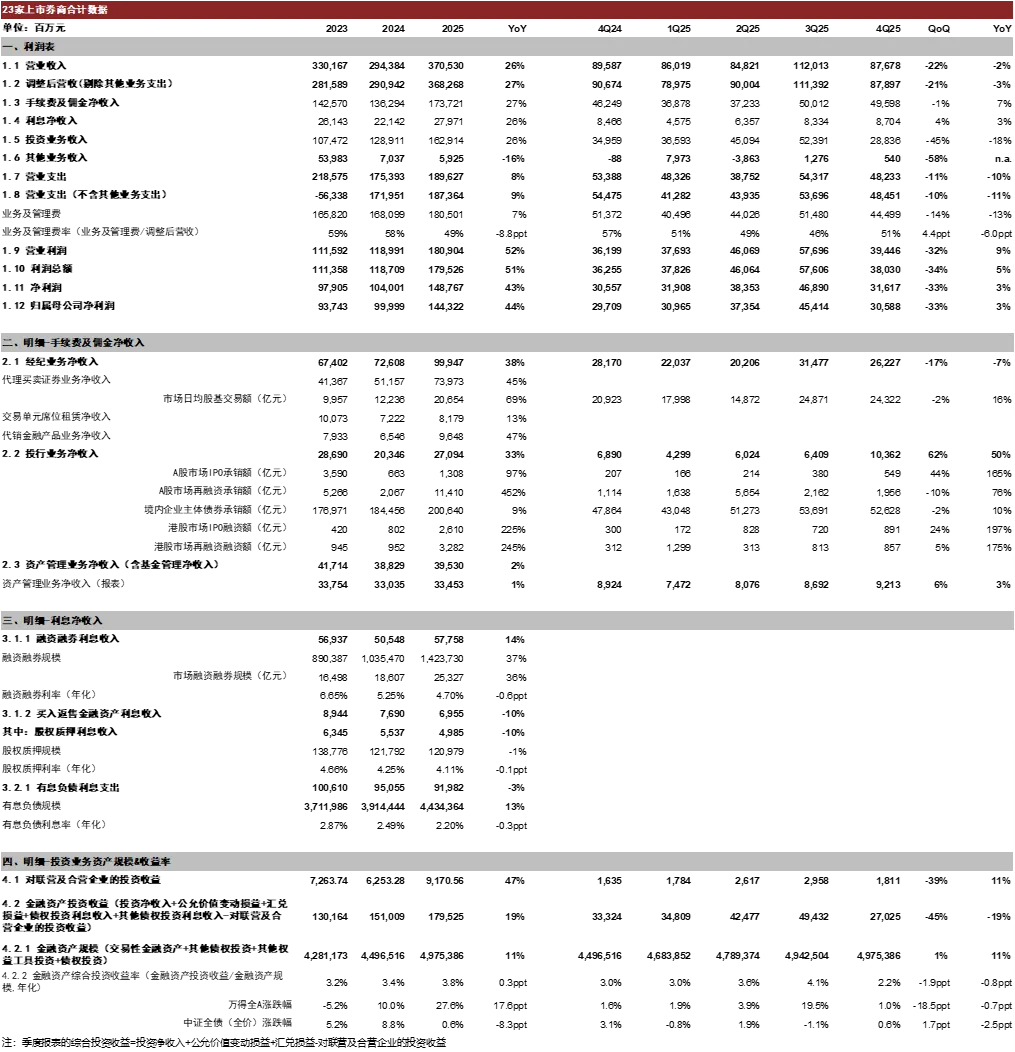 权益市场景气度改善驱动经纪和自营业务高增。1)2025年已发布年报的23家上市券商合计实现经纪业务净收入999亿元、同比+38%;得益于A股日均股基成交额同比+69%。2)投行业务净收入合计271亿元、同比+33%;得益于A股IPO、A股再融资、境内企业主体债承销额、港股IPO、港股再融资同比分别+97%、452%、9%、225%、245%。3)资管业务净收入(含基金管理)合计395亿元、同比+2%。4)利息净收入合计280亿元、同比+26%;其中,两融利息收入合计578亿元、同比+14%,得益于市场两融余额同比+37%。5)投资收入(投资净收益+公允价值变动损益+汇兑损益)合计1,629亿元、同比+26%;其中金融资产规模同比+11%,投资收益率+0.3ppt至3.8%,主要得益于权益市场,万得全A全年涨幅27.6%。