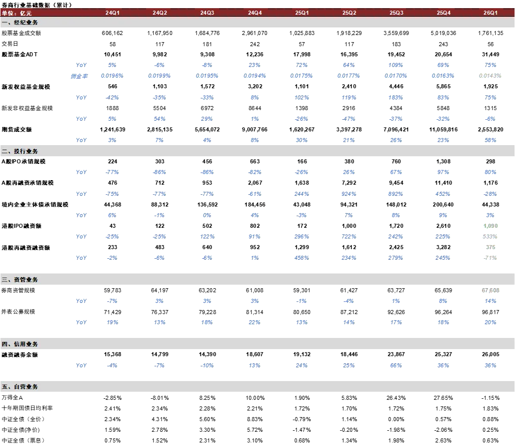 我们预计2026年A股活跃度有望延续,支撑券商盈利的稳健增长。2026年一季度,市场日均股基成交额达到3.1万亿元新高,我们预计全年权益市场有望延续相对较高的交投活跃度,支撑经纪业务收入稳中有升;一季度万得全A涨跌幅为-1%,据中金策略组[1]全年A股有望实现震荡上行,支持自营投资业务保持稳健;股债市场融资额、资管规模、两融规模延续增长态势,投行业务、资管业务、利息收入增长有望延续。