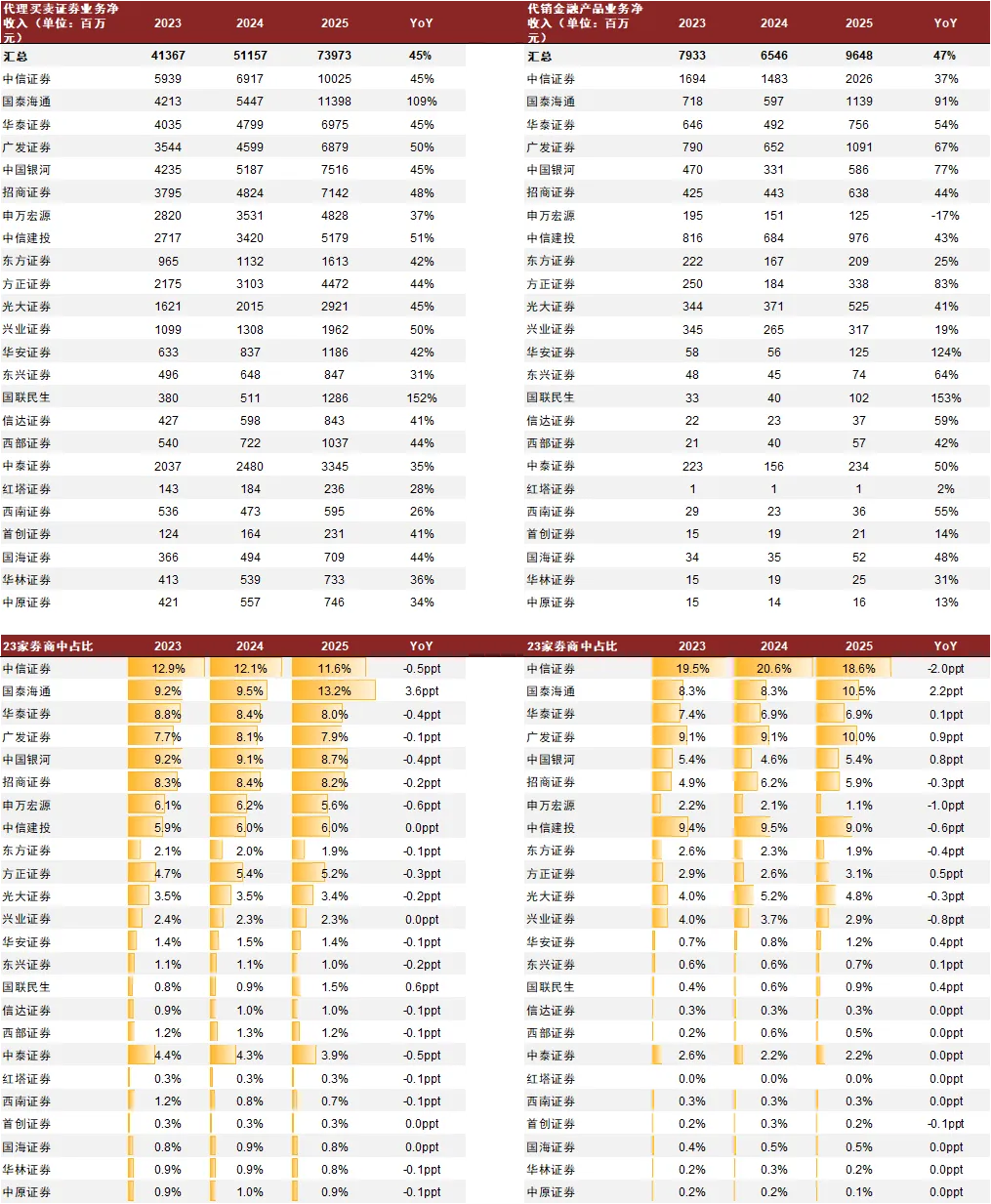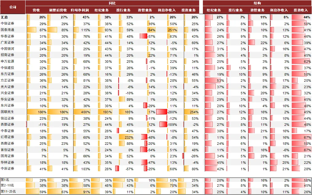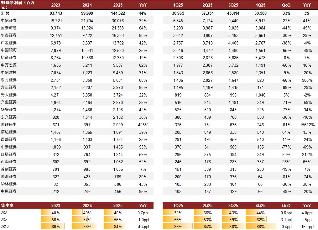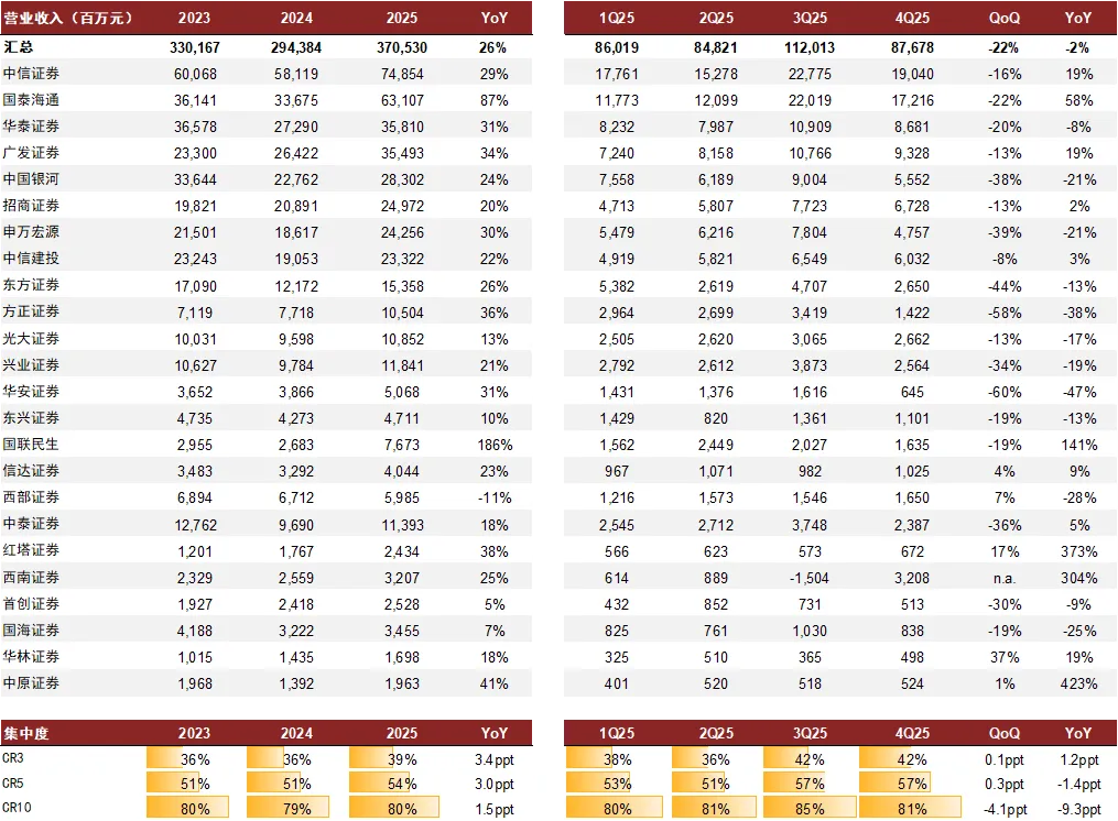 注:国泰海通、华泰证券采用扣非口径;汇总未包含国泰海通、国联民生;CR3、CR5、CR10为25家数据合计中的头部集中度