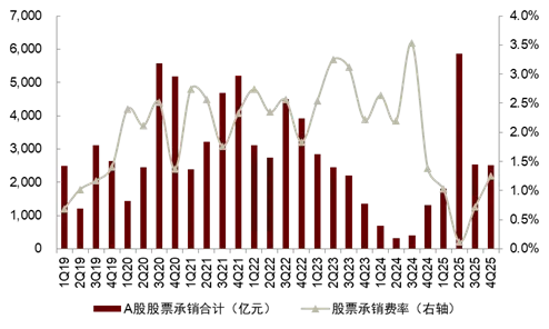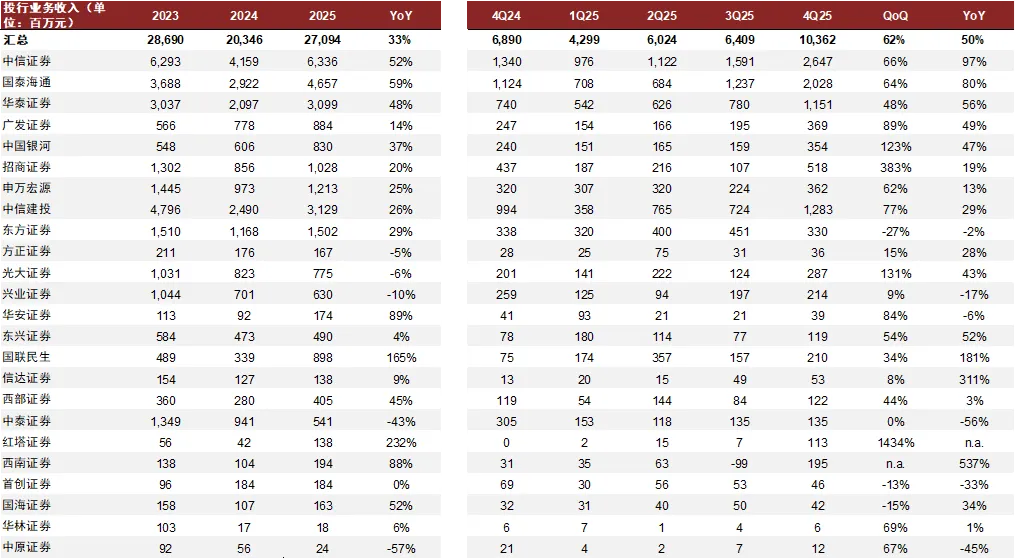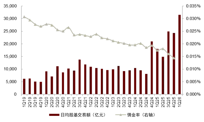 代买在高基数、低费率下,业务增速或将放缓。权益市场前期回暖、带动市场股基交易额同比大幅提升,而在激烈的市场竞争下,2025年交易佣金率快速下行:以23家上市券商代理买卖证券业务净收入同比+45%,而市场股票基金成交额合计+70%测算,佣金率降幅约为15%。我们预计在成交额基数上行、佣金率下行压力下,2026年代买收入增速或将放缓。