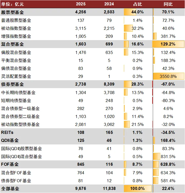 新发混合型基金规模企稳回升,震荡行情中有望重获投资者信任。1)2025Q2以来新发混合型基金规模环比开始改善,全年新发混合型基金同比大幅增长,特别是偏股混合基金和混合型FOF基金:新发偏股混合型基金同比增长132%、占比提升至15%;新发混合型FOF基金同比增长629%、占比提升至9%。2)年初至今的市场波动环境下混合型基金表现优于大盘整体,我们预计主动权益基金产品可以通过更好地匹配投资者的风险收益特征、提升投资者体验,重获投资者信任。我们认为,以权益基金管理见长的公募基金管理人或将迎来回归,支撑母公司资管业绩持续发力。