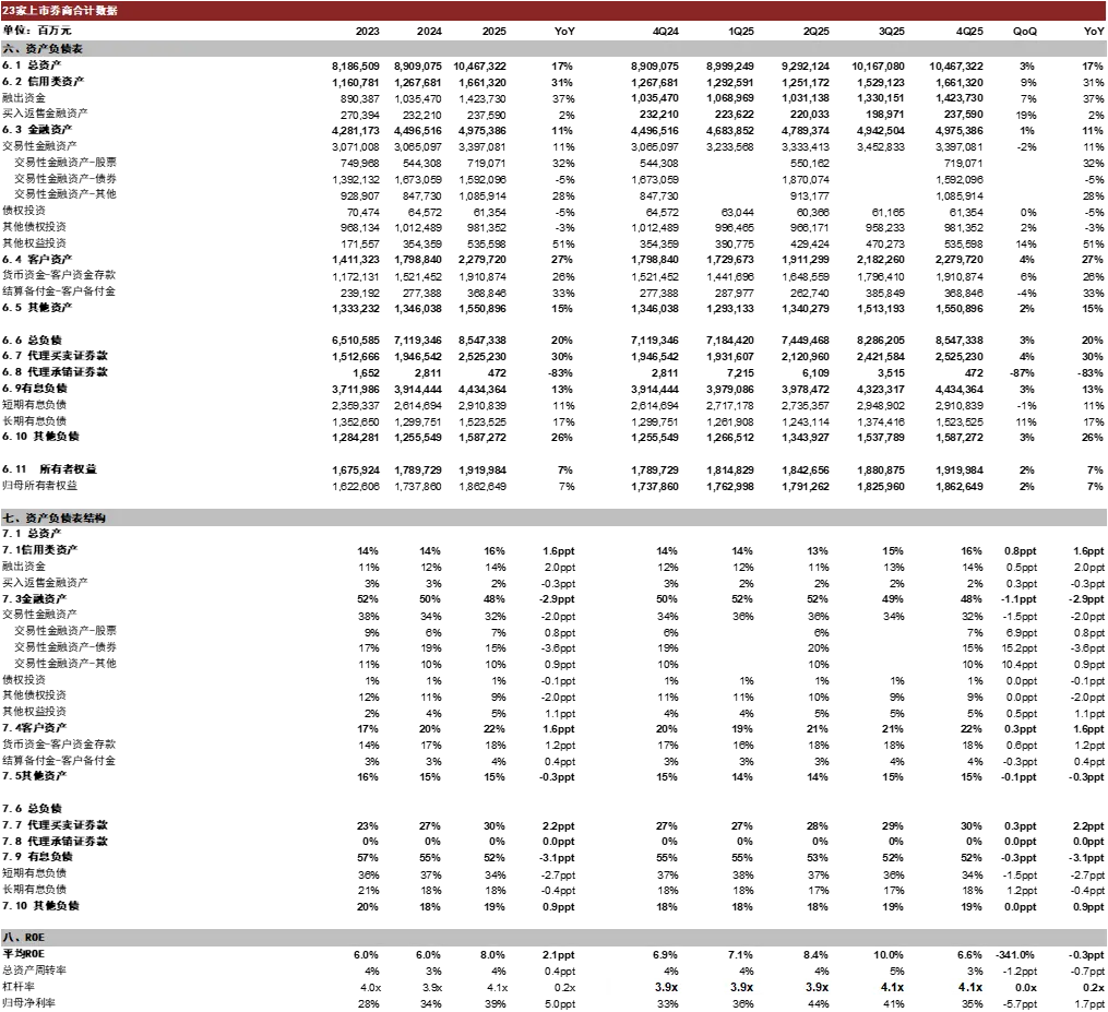 整体资产规模持续扩张,信用类资产和客户资产增长更快。2025年23家上市券商资产负债表规模持续扩张、同比+17%,杠杆率同比+0.2x至4.1x。权益市场景气度驱动下,信用类资产和客户类资产增长更快,同比增速分别+31%、+27%;同时,上市券商积极增加金融资产规模以增厚投资收益,金融资产规模同比+11%。