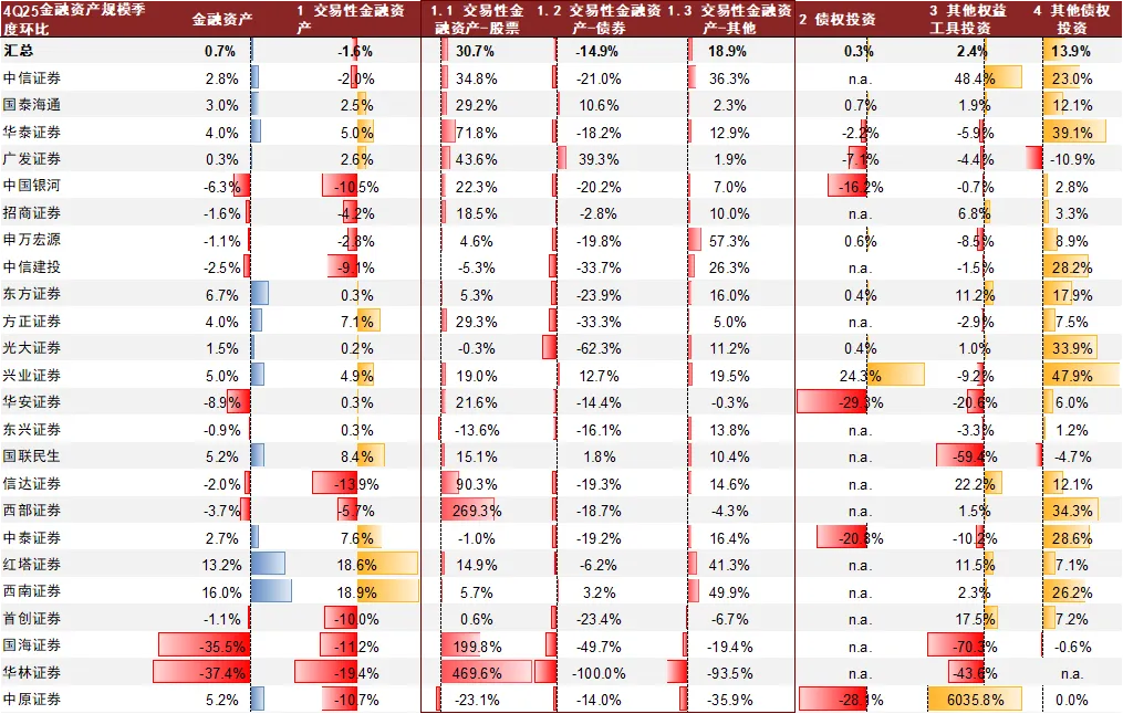 自营业务持续推进非方向性投资转型,我们预计场外衍生品的规范发展将为转型带来空间。1)2025年交易性金融工具的投资收益仍然是券商投资收益最主要的来源、对头部券商的投资收益贡献达到78%,其他权益工具的分红和其他债权投资的收益兑现起到收益增厚的作用、收益贡献分别为11%和4%,我们认为交易性金融工具的收益稳健性对于投资收益稳健性至关重要。2)利率波动环境下,行业整体降低交易性债券的占比,2025年下半年行业整体(包括头部券商在内)显著降低了交易性债券的规模,年底余额较年中下滑15%。同时,行业整体增配能够实现稳健高收益的其他权益工具投资,4Q较3Q环比+2%。此外,场外衍生品业务的收益在资本金业务中较为稳健,2025年权益衍生品工具名义本金占金融资产规模实现企稳回升,我们预计后续衍生品业务的规范发展将带来更大的业务空间。