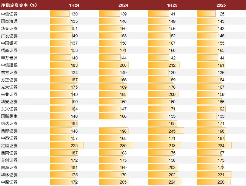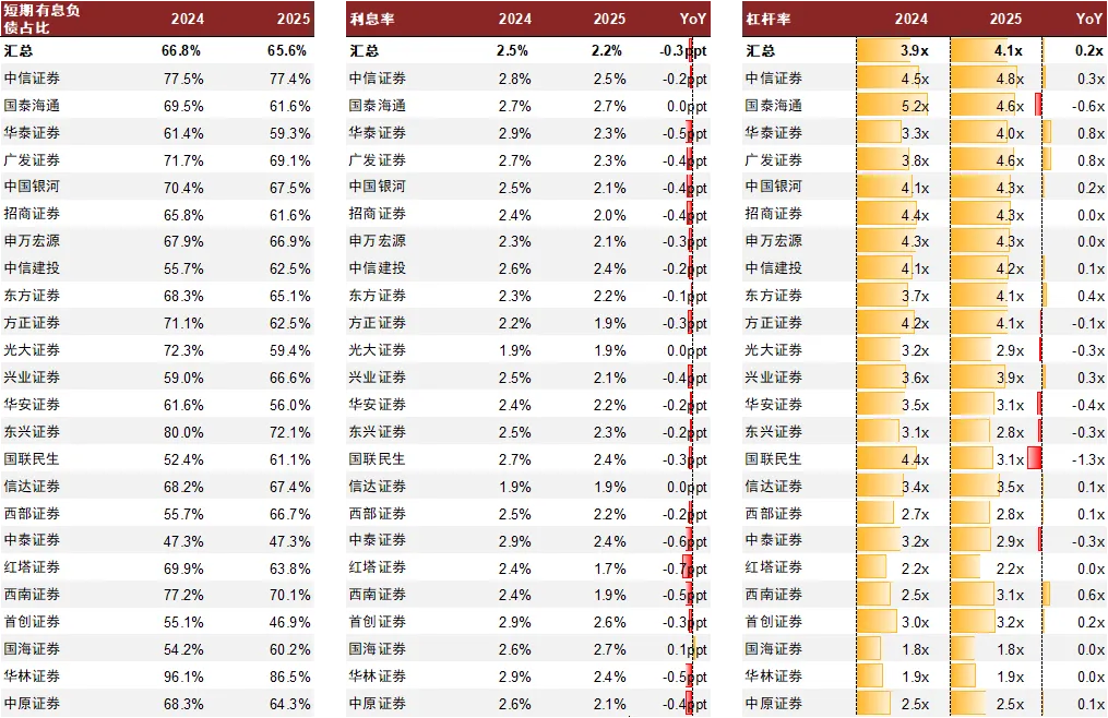 部分券商在负债端通过灵活地增加短债扩表,我们预计是否有收益足够高的业务/资产覆盖长债成本,将成为能否持续扩表的关键。利率波动环境下,部分头部券商通过更灵活的短期负债实现快速扩表,短期负债占有息负债比重达到近70%及以上水平、高于行业平均。短债扩表的负债策略导致净稳定资金率下降,部分券商净稳定资金率指标的使用已较为充分。我们预计2026年是否有收益率足够覆盖长债成本的业务/资产,将成为能否持续扩表的关键。