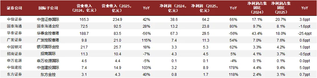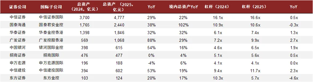 跨境自营及客需业务与港股投行业务是国际业务两大重要增量。1)2025年头部券商国际业务营收及净利润水平实现持续高增,增速多数快于集团整体营收及净利润的增速,净利润贡献实现提升。2)2025年境外机构投资A股的北上投资需求、及境内机构配置境外高收益资产的需求,带来高收益率的境外资本金业务。为把握境外资本金业务扩张机会,中资券商加速境外扩表,国际子公司总资产增幅显著高于集团整体。而境外高利率环境下,为满足用资需求,头部券商增资国际子公司案例频发。往后看,我们认为随着场外衍生品业务的规范发展,境外资本金业务仍有较大增长潜力。3)头部券商在港股投行业务上更具优势,对投行业务的收入形成重要贡献,我们预计尤其是港股股权投行业务将进一步放大头部券商投行业务的领先优势。