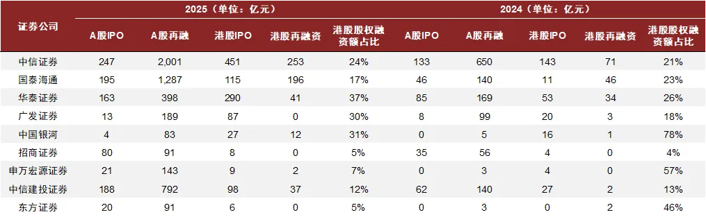 注:汇总表未纳入国泰海通、国联民生,且华泰证券采用扣非口径;港股股权融资额以当年12月31日汇率换算为人民币