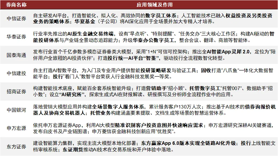 #8 数智化转型持续深化、AI投入逐步聚焦高ROI领域。2025年AI应用浪潮下,券商信息技术投入较2024年实现同比高增、占营收比重多数同比增长。随着华泰涨乐AI APP等标志性成果的推出,券商AI应用从业务赋能开始走向对客服务,AI应用范围更加广泛、投入的ROI将逐步形成差异。我们预计证券行业AI应用将逐步探索聚焦高ROI领域,各家的投入方向差异预计将带来未来服务能力的差异,可重点关注AI在智能投顾和智能投研方向的应用。