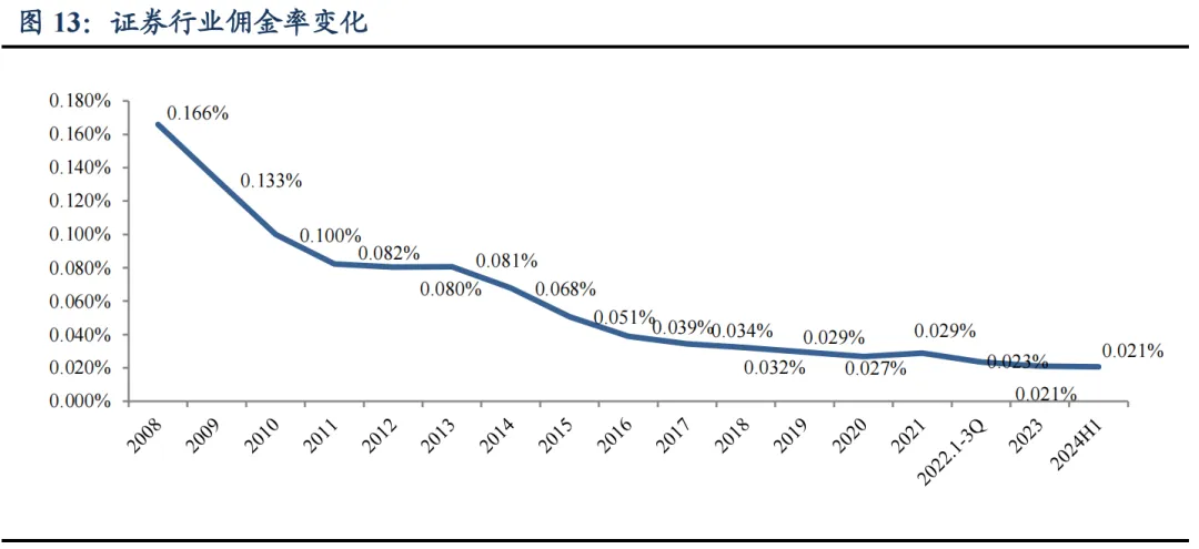 2009年行业佣金率大概在千分之一点五左右,到2012年已经降到了千分之一以下。这个趋势在之后的十几年里愈演愈烈,成为压垮传统经纪业务商业模式的第一块多米诺骨牌。