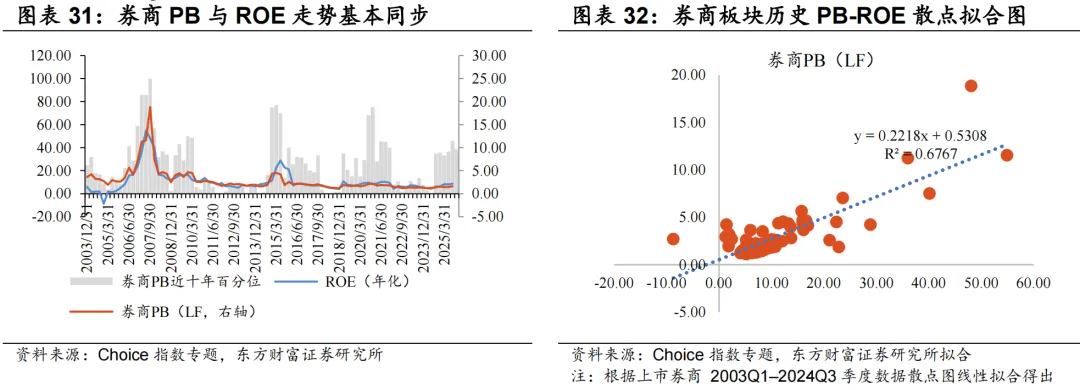 周期性因素:券商的ROE随市场周期大幅波动。当市场处于底部时,ROE极低,市场给的是「清算价值」或「壳价值」,PB往往跌破净资产;当市场处于顶部时,ROE极高,PB也会系统性抬升。这种由周期驱动的PB波动,本质上是估值的波动,而不是公司价值的波动。