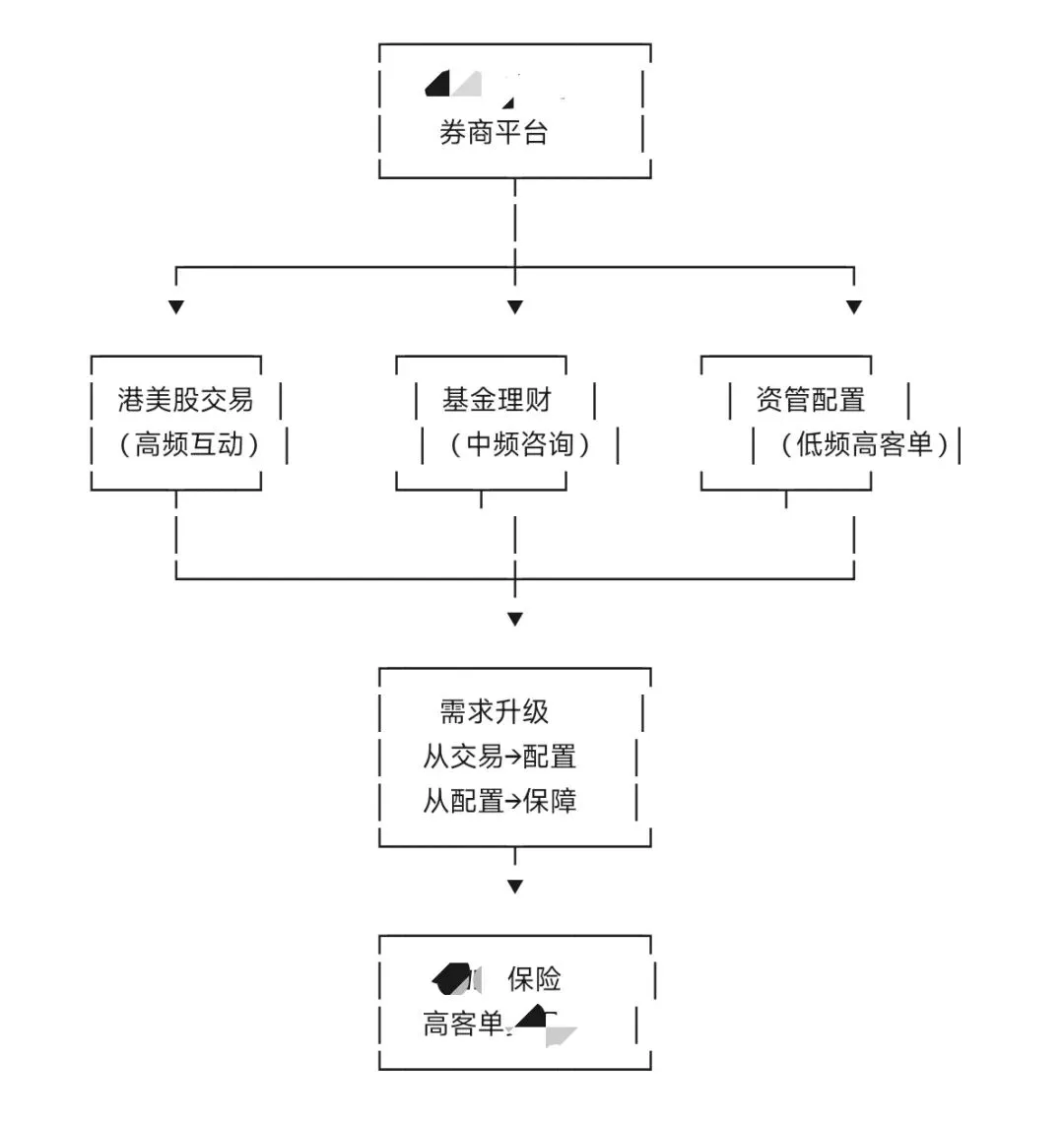 第一层:券商满足"赚钱"需求(交易、打新)→ 建立信任+高频触达;