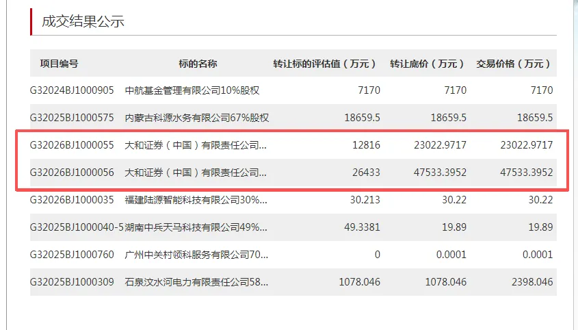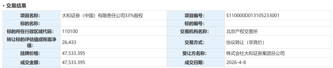 北京产权交易所披露信息显示,大和证券(中国)有限责任公司(下简称大和证券(中国))16%股权已于日前完成交易,成交金额约2.3亿元,受让方为株式会社大和证券集团总公司。与此同时,该公司另一笔33%股权也同步完成挂牌转让,成交金额约4.75亿元,受让方同为株式会社大和证券集团总公司。两笔交易合计对价约7亿元。本次两笔股权转让的标的合计占大和证券(中国)股权的49%,为两家中方股东的全部持股。