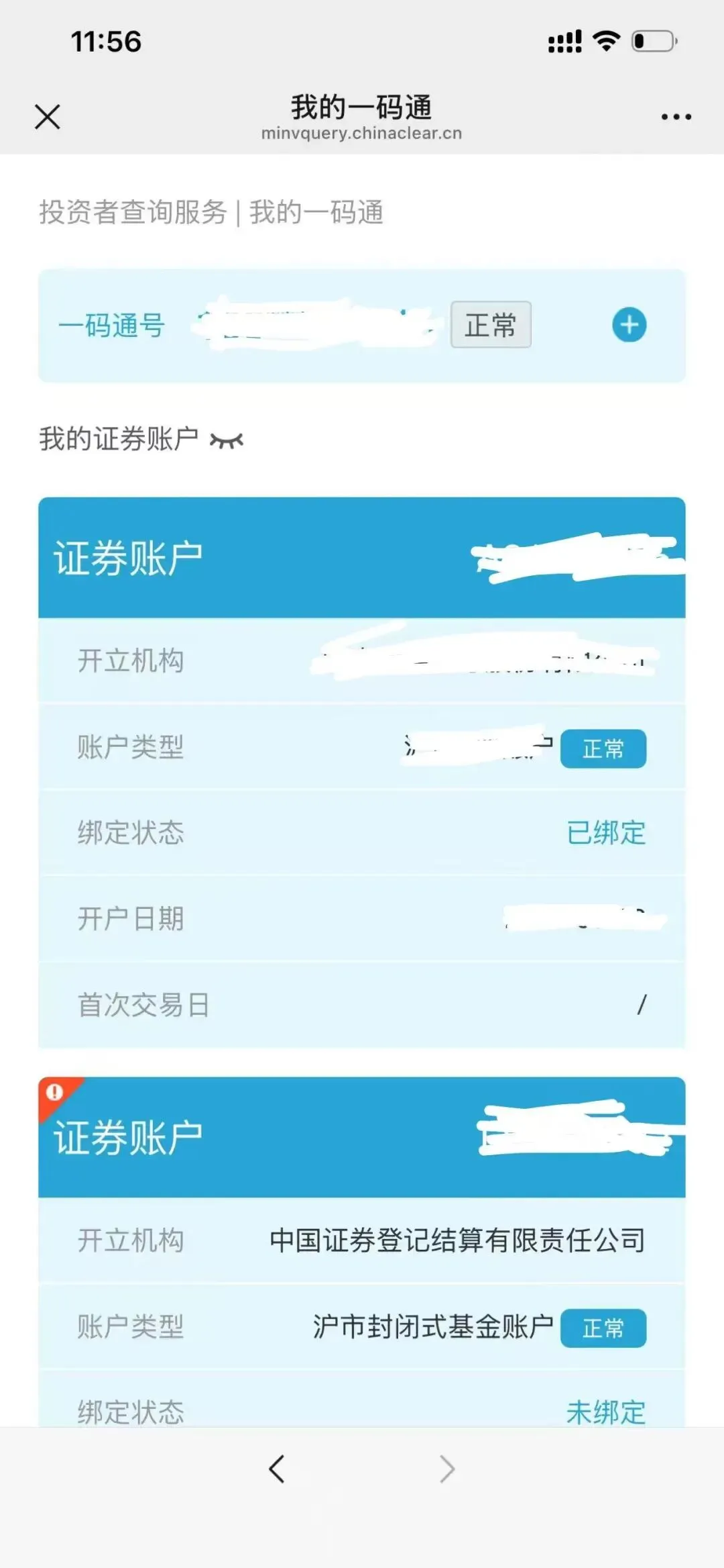 - 开完后注意应该会有4个账户:一码通账户(多个券商共享1个)、沪市A股账户、深市A股账户、封闭式基金账户;信息可以通过微信服务号"中国结算营业厅"进行查询。