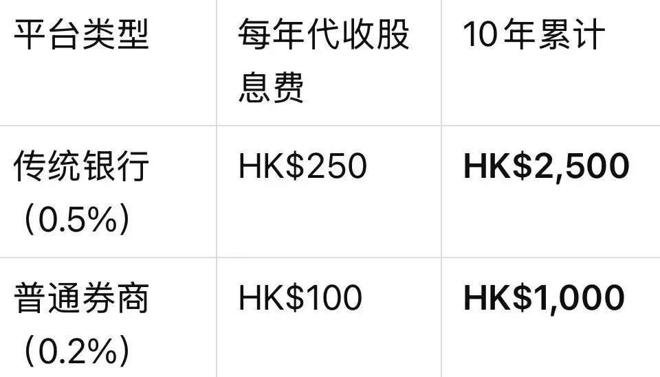 这还只是代收股息费一项,如果再算上存仓费(银行每年可能再收HK$100-HK$300),差距还会更大。