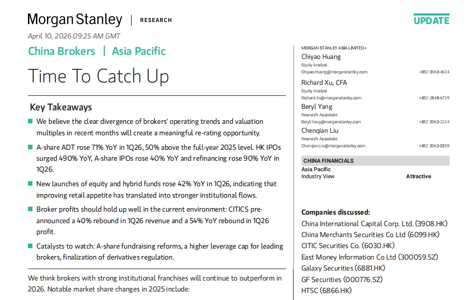 摩根士丹利认为,具备强大机构业务实力的券商将在2026年继续跑赢。重点关注:
