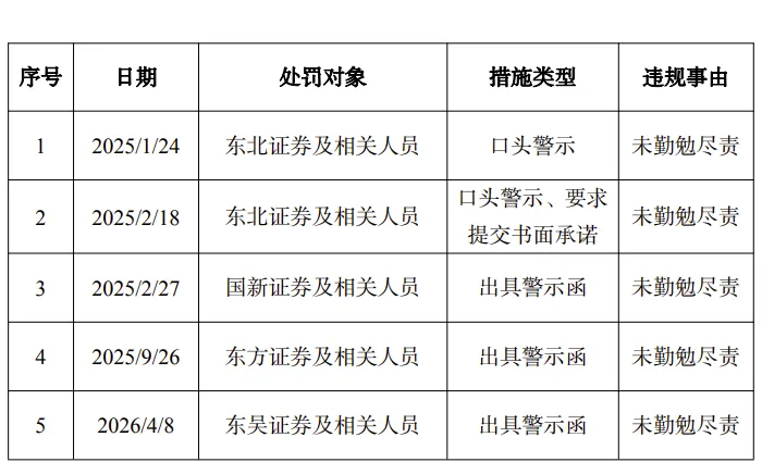 《关于对会员及其他交易参与人采取自律监管措施的情况公示》涉及东北证券、国新证券、东方证券、东吴证券,其中东北证券被两次采取自律监管措施。5家次券商的违规事由均为未勤勉尽责。措施类型方面,东北证券及相关人员一次被采取口头警示、第二次被采取口头警示、要求提交书面承诺,国新证券、东方证券、东吴证券则均为出具警示函。采取自律监管措施的时间从2025年1月24日到2026年4月8日,跨度比较长。