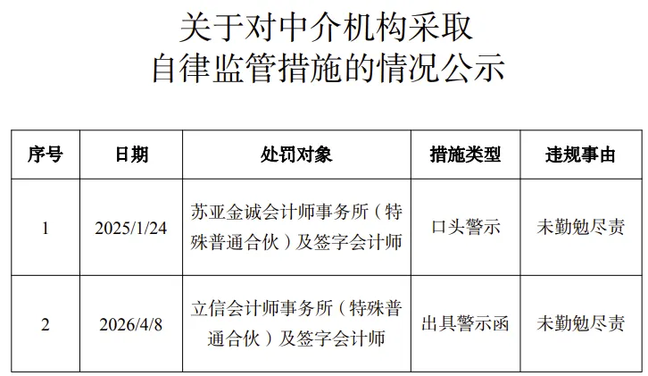 《关于对中介机构采取自律监管措施的情况公示》涉及两家会计师事务所。苏亚金诚会计师事务所(特殊普通合伙)及签字会计师、立信会计师事务所(特殊普通合伙)及签字会计师,违规事由均为未勤勉尽责,措施类型分别为口头警示、出具警示函。
