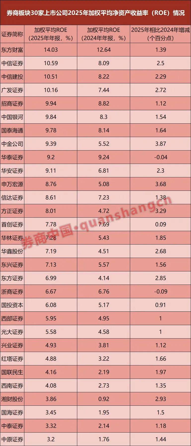 值得一提的是,从券商板块目前已披露的30家公司来看,2025年ROE的中位数约7.24%,平均数为7.35%。