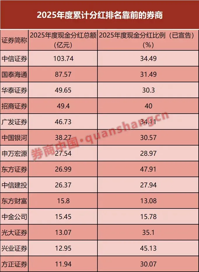大中型券商是分红的“主力军”。中信证券以103.74亿元的现金分红总额排名第一,分红比例高达34.49%;国泰海通以87.57亿元的分红总额排名第二,分红比例超31%;华泰证券、招商证券、广发证券2025年度分红总额也近50亿元。