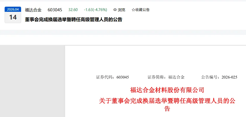 福达合金材料股份有限公司(以下简称“公司”)2026年4月13日召开2026年第三次临时股东会,选举产生了公司第八届董事会非独立董事和独立董事。同日,公司召开第八届董事会第一次会议,选举产生第八届董事会董事长、董事会各专门委员会委员,并聘任了公司总经理、副总经理、财务总监和董事会秘书。具体情况如下: