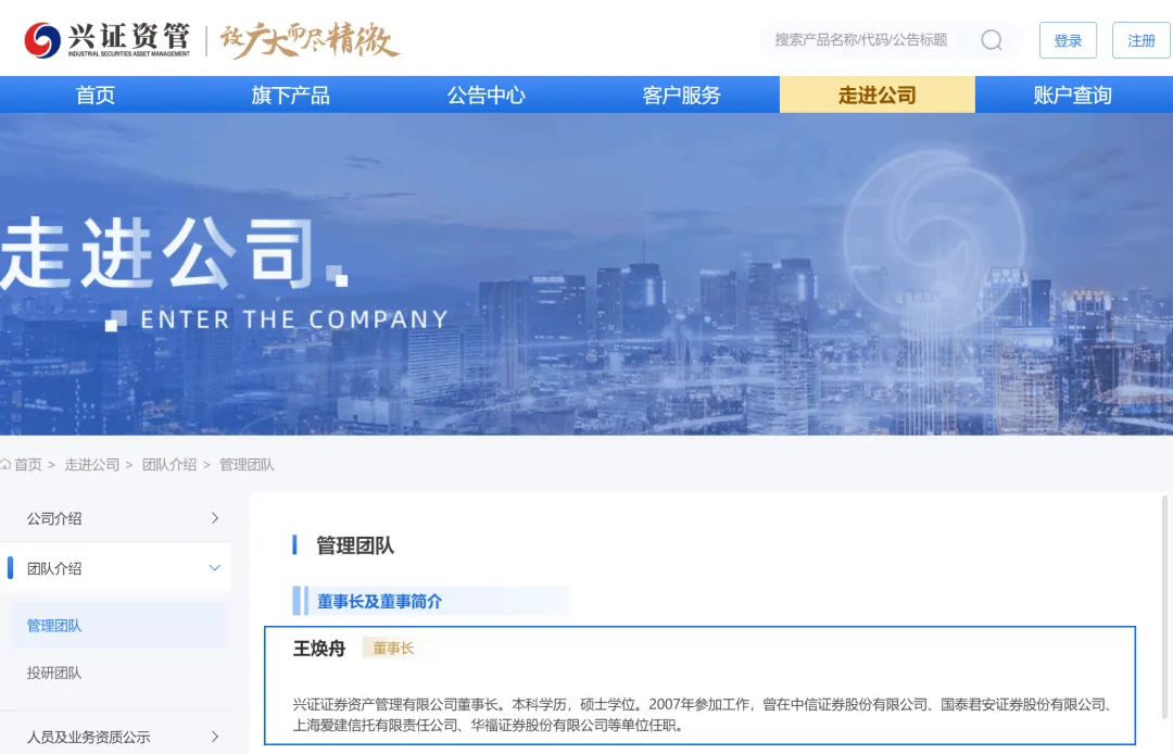 王焕舟还兼任中国银行间市场交易商协会第五届金融衍生品专家委员会委员、第三届从业人员培训专家委员会委员等职务。目前,兴证资管官网已更新管理团队信息。