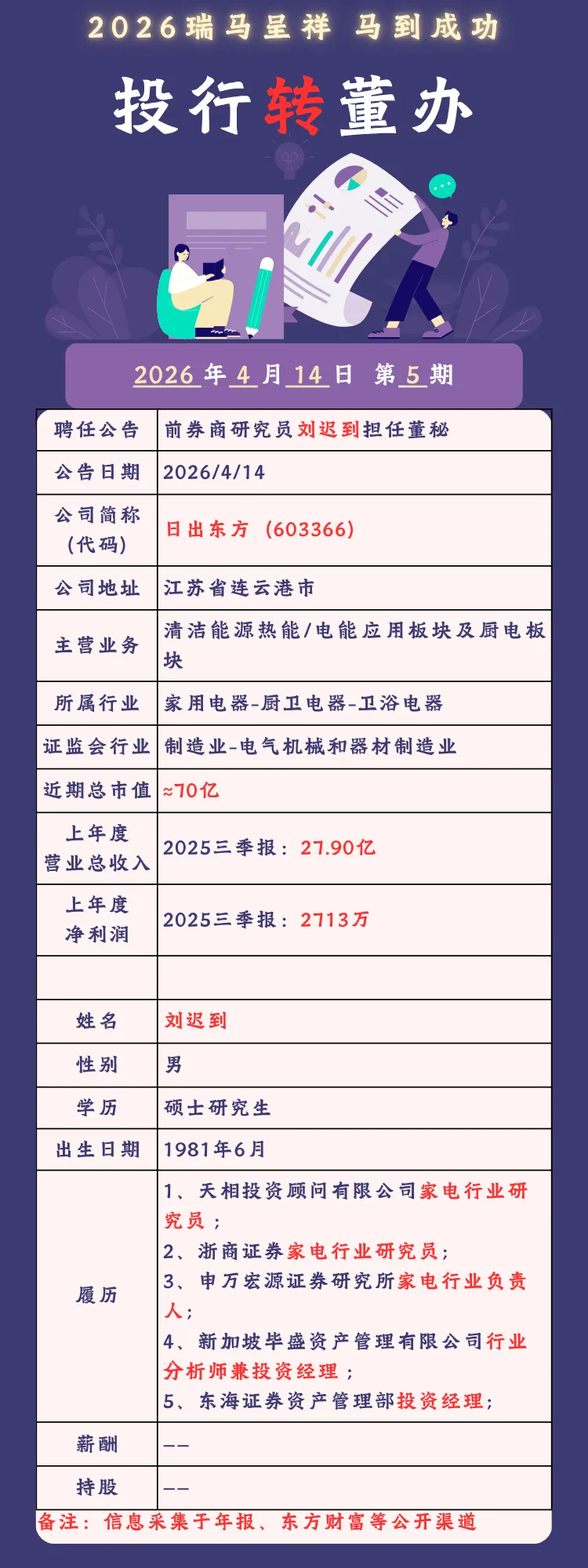 2026年4月14日 第5期 前券商研究员“刘迟到”担任董秘2026 年4 月14 日 第5期已成立“并购小猪交流”微信群(券商投行专群/其他群),关注公众号的读者,可以扫描社群管理员二维码,申请入群交流。⟬推荐关注⟭●优质公众号推荐●优质小程序推荐免责声明:本文根据公开资料撰写,无法保证公开资料的准确性。在任何情况下,本文仅作为参考。转载本文时,需在正文前显著位置标注文章来源。作者介绍:任职于咨询机构,一线承揽人员,工作之余统计证券业投行保代动态变化。同时,积极推荐投行、董办、投资机构等岗位,欢迎勾兑并购资源。关注我,让我们共同成长!