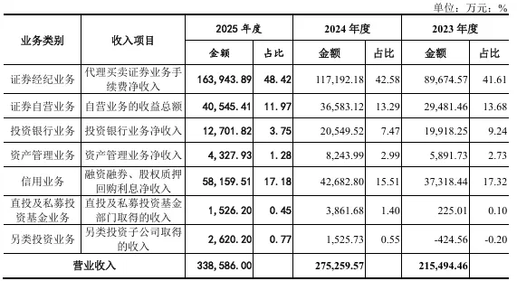 作为扎根东莞的区域性券商,经纪业务始终是东莞证券的核心收入支柱。2025年,公司代理买卖股票基金交易金额达8.33万亿元,同比增长59.75%;代理买卖证券业务手续费净收入16.39亿元,占营收比重达48.42%,近乎撑起公司营收“半壁江山”。若叠加信用业务(主要为融资融券)收入,两大业务合计贡献营收占比超65%,成为公司业绩的“压舱石”。