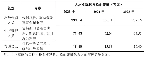 薪酬体系改革同步推进,呈现“高管降薪、员工涨薪”的差异化调整态势。2025年,公司高级管理人员人均实际核发税前薪酬233.54万元,同比下降6.63%,平均降幅16.57万元;中层及基层员工薪酬则实现稳步上涨,其中中层管理人员人均薪酬71.43万元,同比增长15.14%,平均上涨9.39万元;普通员工人均薪酬19.35万元,同比增长22.24%,平均涨薪3.52万元。