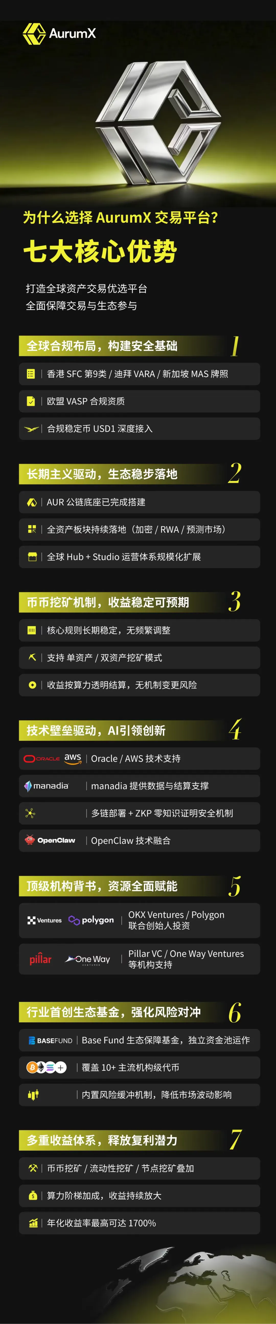 AurumX正在打造新一代AI驱动的机构级全球资产金融交易系统,其战略支持阵容强大,包括OKX Ventures、AUR labs、Polygon、Manadain Capital、Pillar VC、One Way Ventures、Quasar Holding、Oracle(甲骨文)、AWS(亚马逊云科技)等顶级投资机构和生态伙伴。