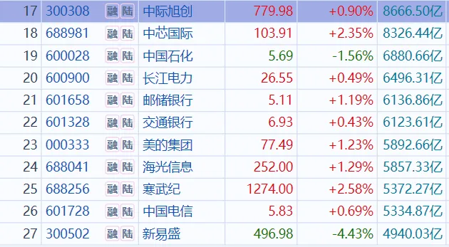 截止15日收盘,中际旭创总市值8666亿元,位列所有A股第17名,超过了中芯国际、中国石化、长江电力、邮储银行、交通银行、美的集团、中国电信等企业。