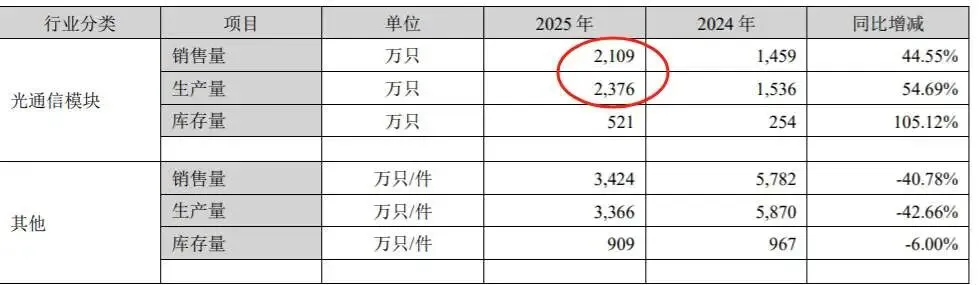 中际旭创的核心产品是400G、800G和1.6T等高速光通信收发模块。2025年公司产量2376万只,销量2109万只。无论是产量还是销量,2025年相比于2024年均大幅提升。