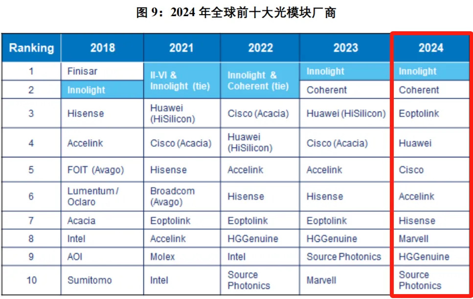 根据“2024年全球前十大光模块厂商”排名来看,中际旭创位居第一,这体现了公司的行业龙头地位!第二名是美国高意,中国厂商新易盛位居第三名。此外,华为、思科、光迅科技、海信宽带、迈威尔、华工正源、索尔思光电都位列前十。前十席位中,中国厂商有7个。
