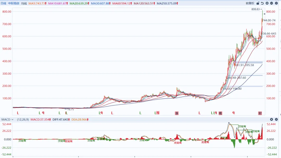 2023年,股价大涨342%;2024年上涨54%;2025年再度大涨397%;今年以来涨幅已超过28%。从2023年至今3年多,股价累计涨了42倍,堪称涨到“头晕目眩”。今天盘中最高涨到808元/股,总市值逼近9000亿元大关。